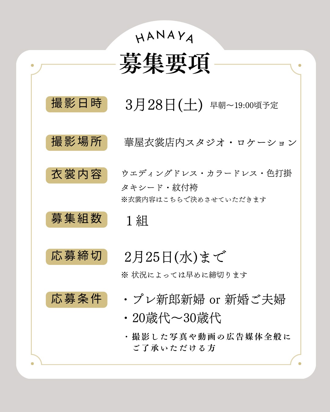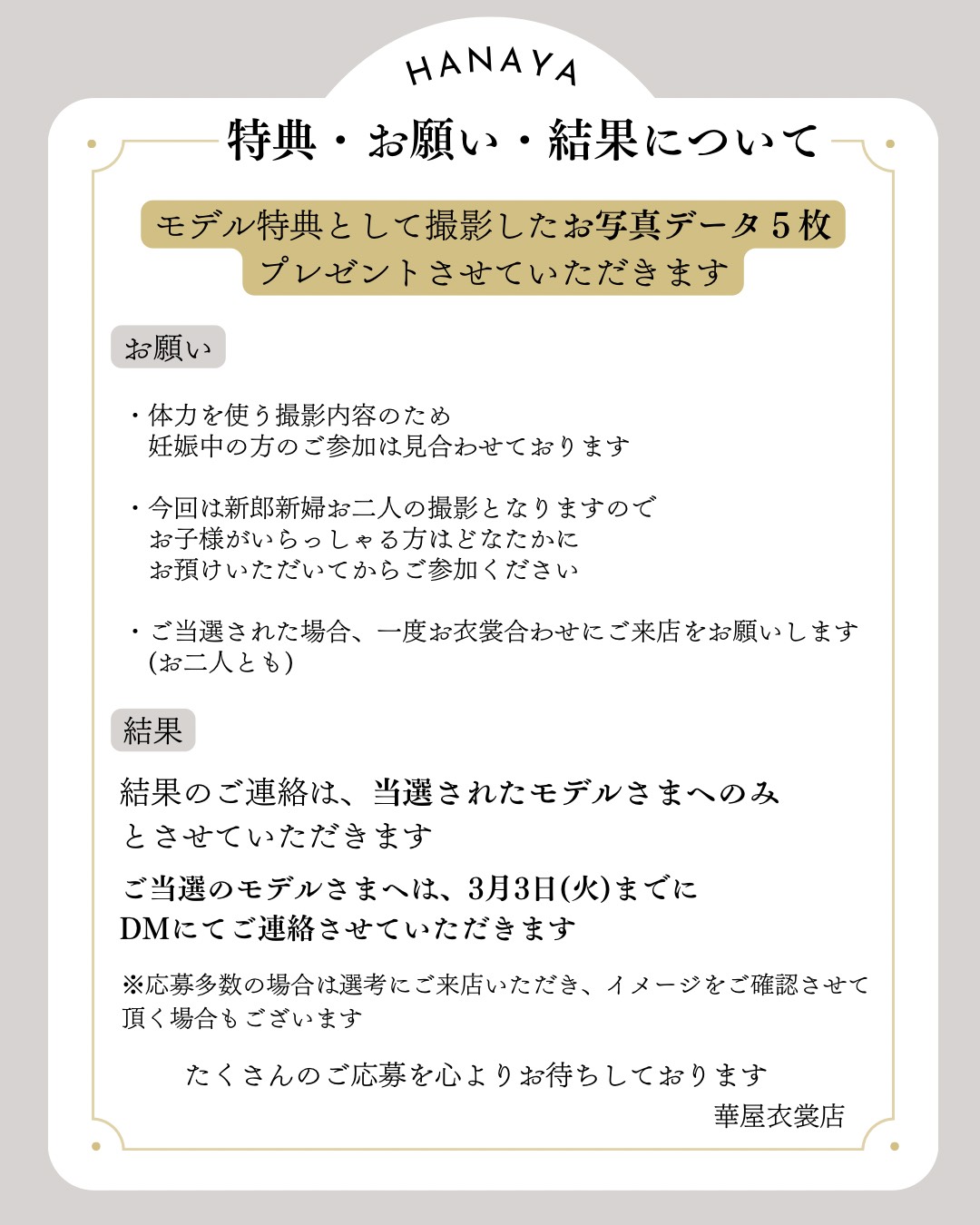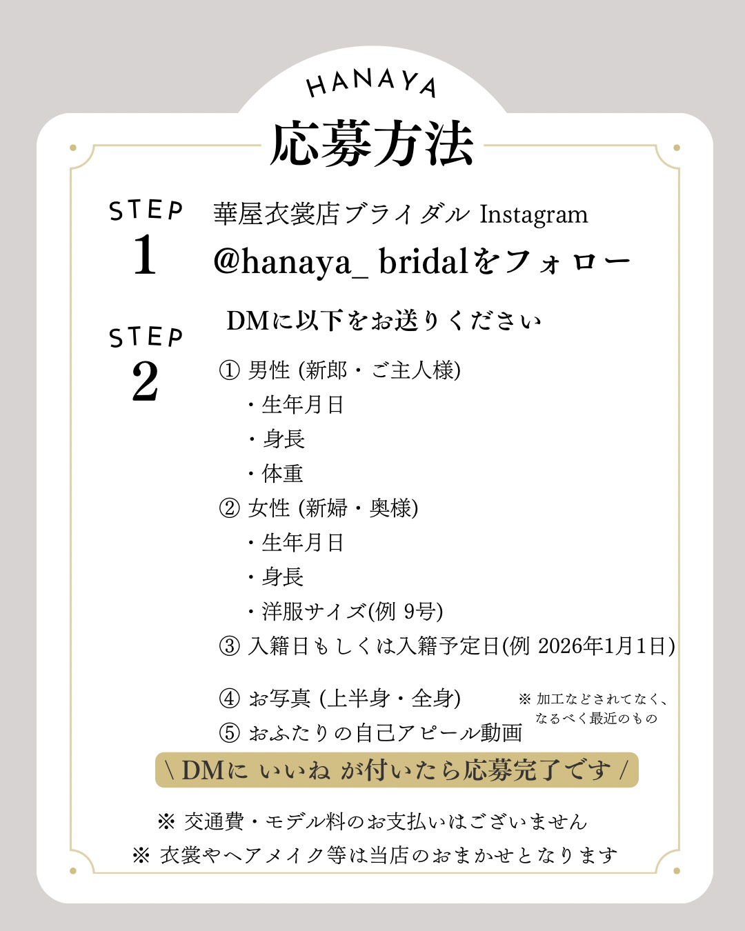 ※ご当選された場合、一度お衣裳合わせにご来店をお願いします(お二人とも)
