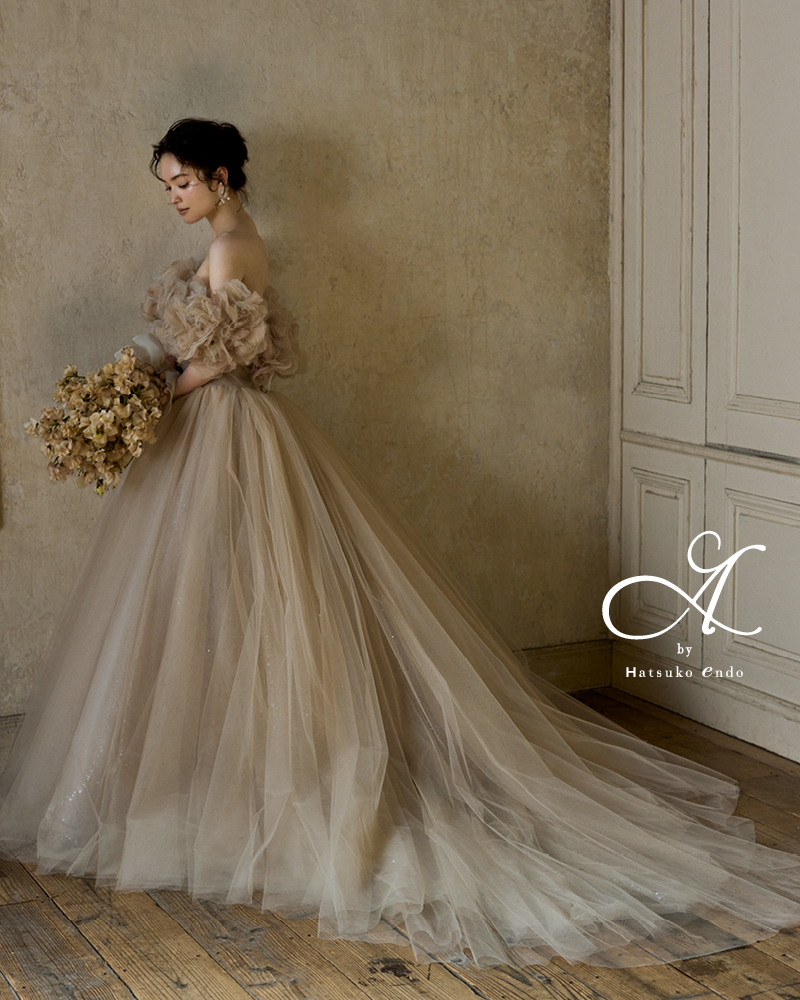 こぼれ落ちるようなイメージで配置されたオフショルダーのコサージュがデコルテを飾ります