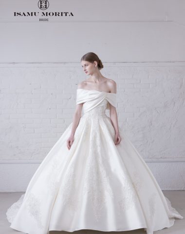光沢のある織りのサテンだけで魅せるシンプルながらもこだわりぬいたイサムモリタのマーメイド目線を上へ向けるよう細かく設定された くびれ により脚長効果も抜群。