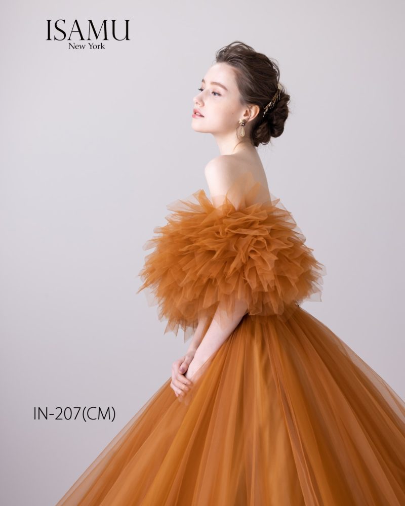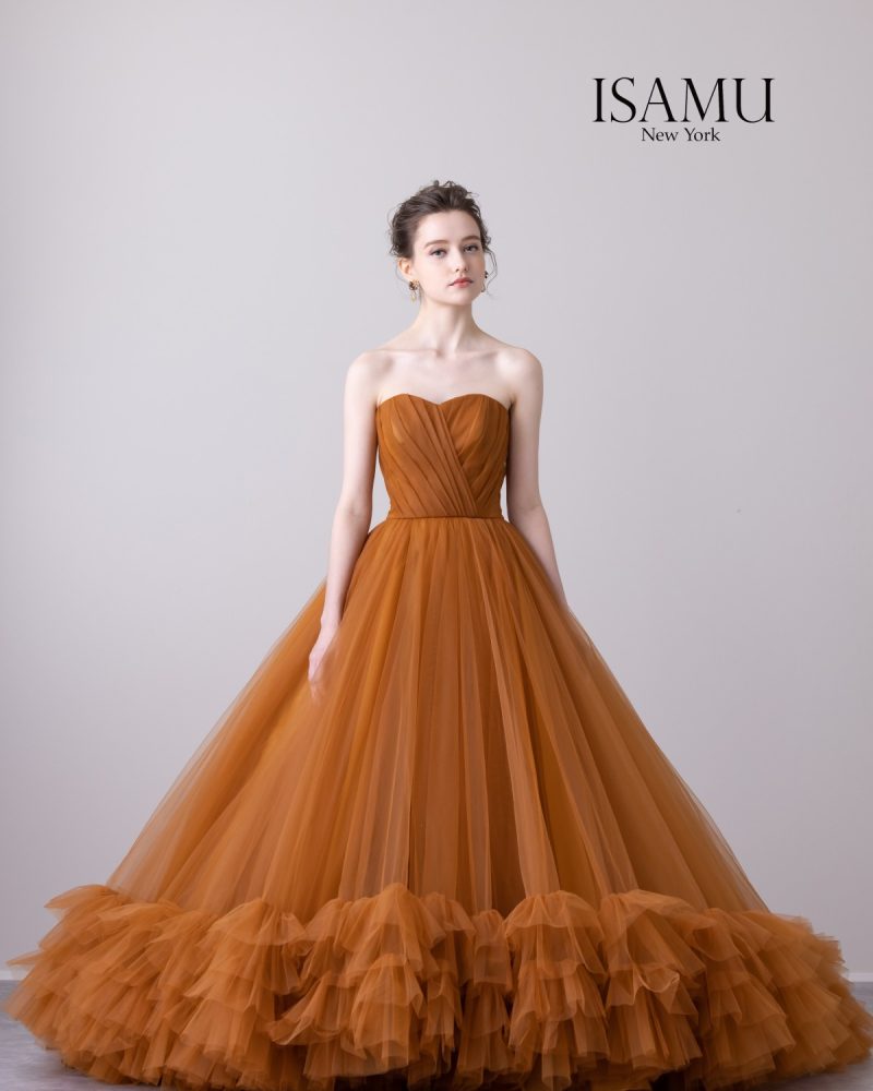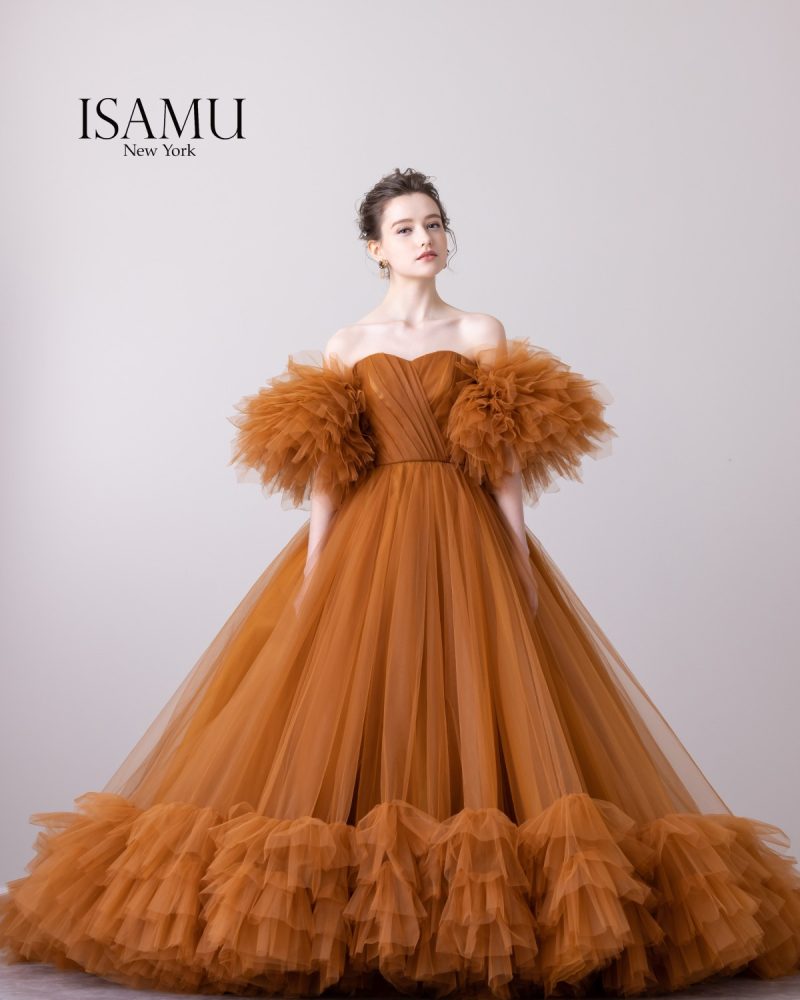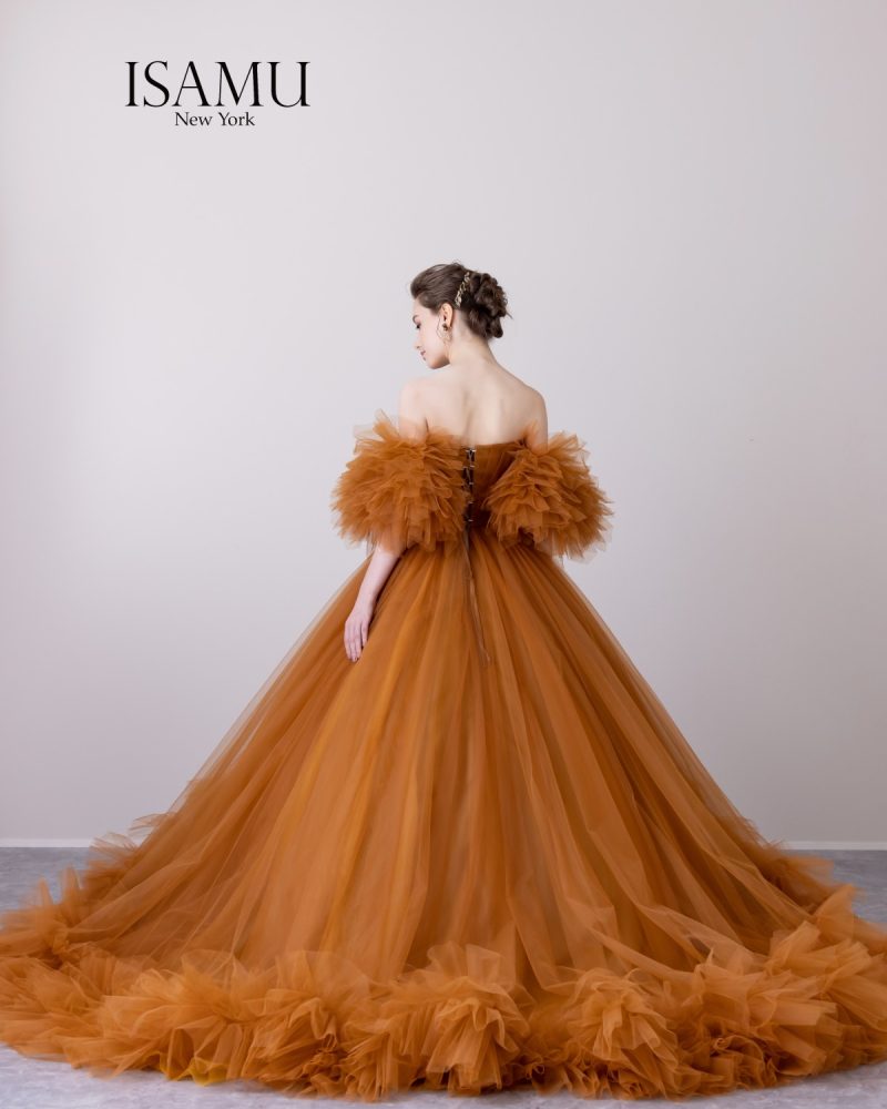 ボリューミーかつ、ドラマティックなスカートシルエットは、インターナショナルなオートクチュールのトレンドの世界観を、表現しております圧倒的なスケール感とシンプルな美しさのどちらも表現されたドレスはトレンドに敏感な花嫁様に是非、纏