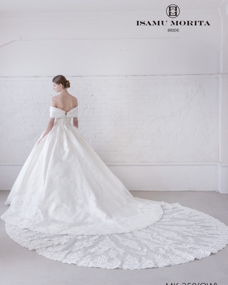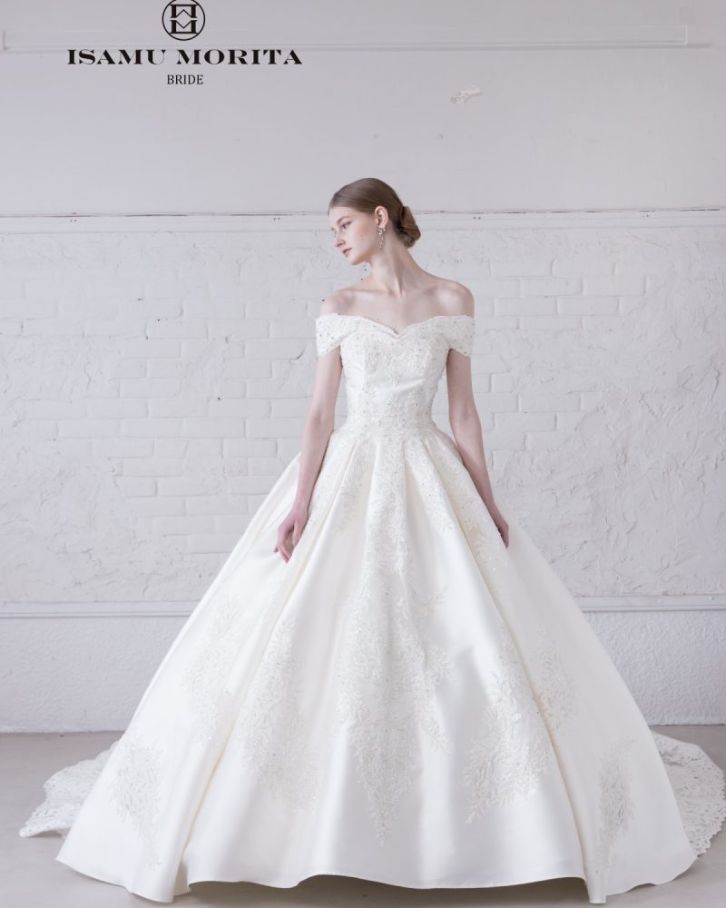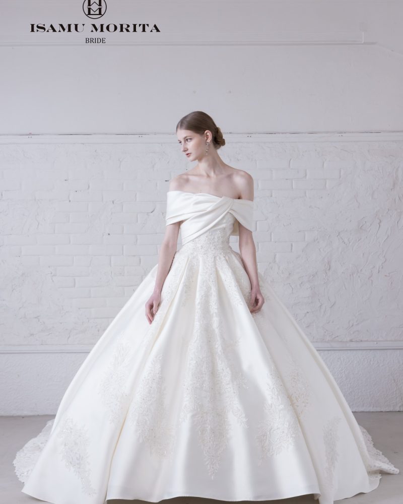 シンプルながらスタイルをよく見せてくれるこだわりのデザインが魅力的な1着。こちらも数種類のオフショルダーから選ぶことができ、動きのあるスタイルからクラシカルな花嫁姿まで叶えてくれます。