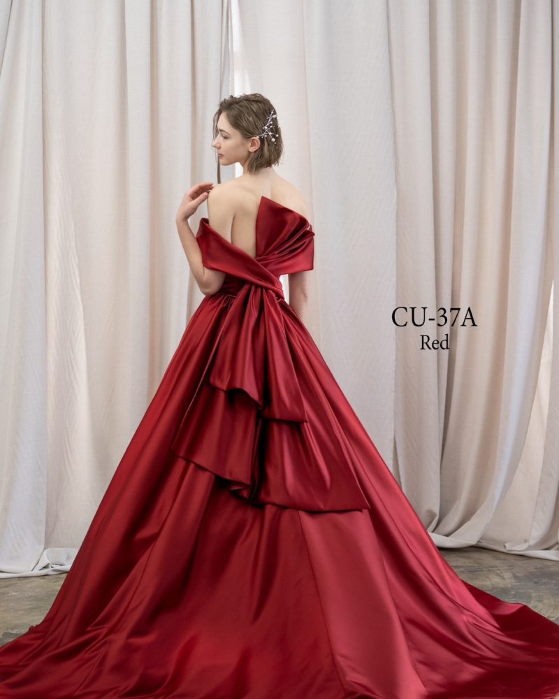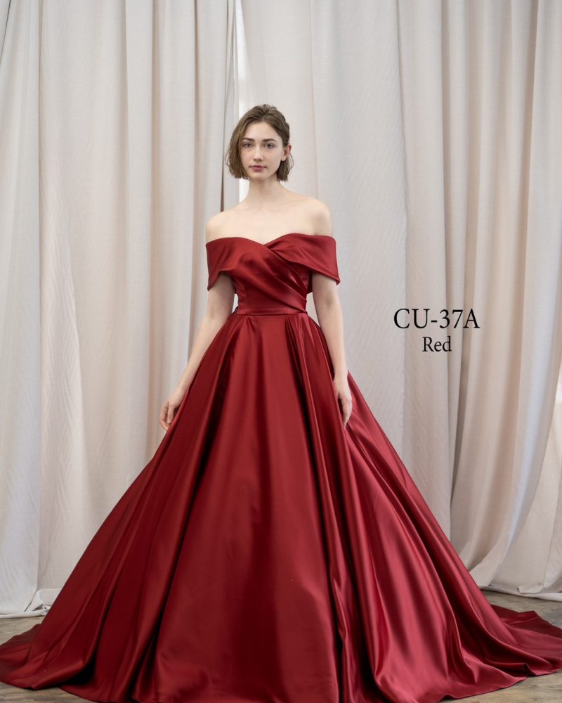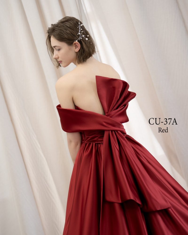 デコルテを美しく見せるオフショルダーのフロントから、印象に残る立体的なバックリボンが大人の優雅さを表現します。上質なサテンとシックなレッドが、シンプルなAラインをさらに引き立ててくれます。
