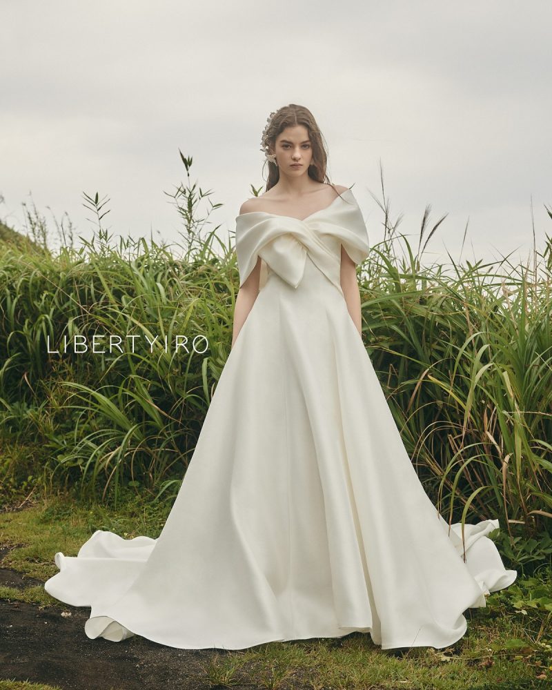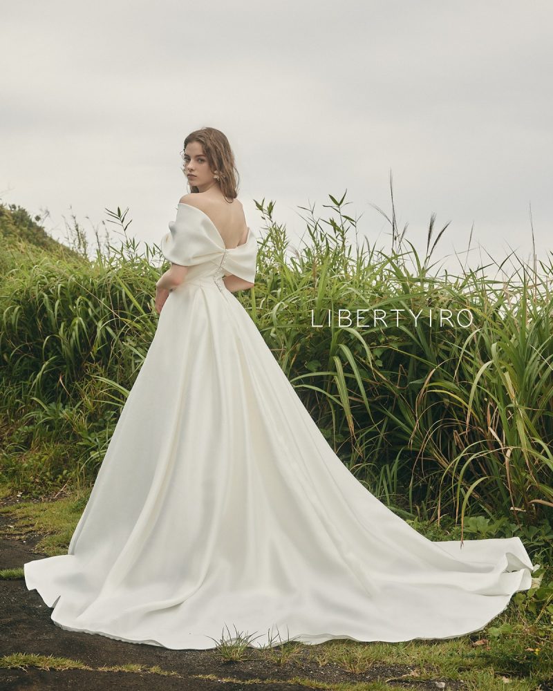 足長効果があり、デコルテも美しく魅せることが可能です。スカートはたっぷり生地を使用しているので様々な写真を撮ることが可能で、たくさん生地を使っていても着ていただいたとき比較的軽いので疲れにくい1着です。