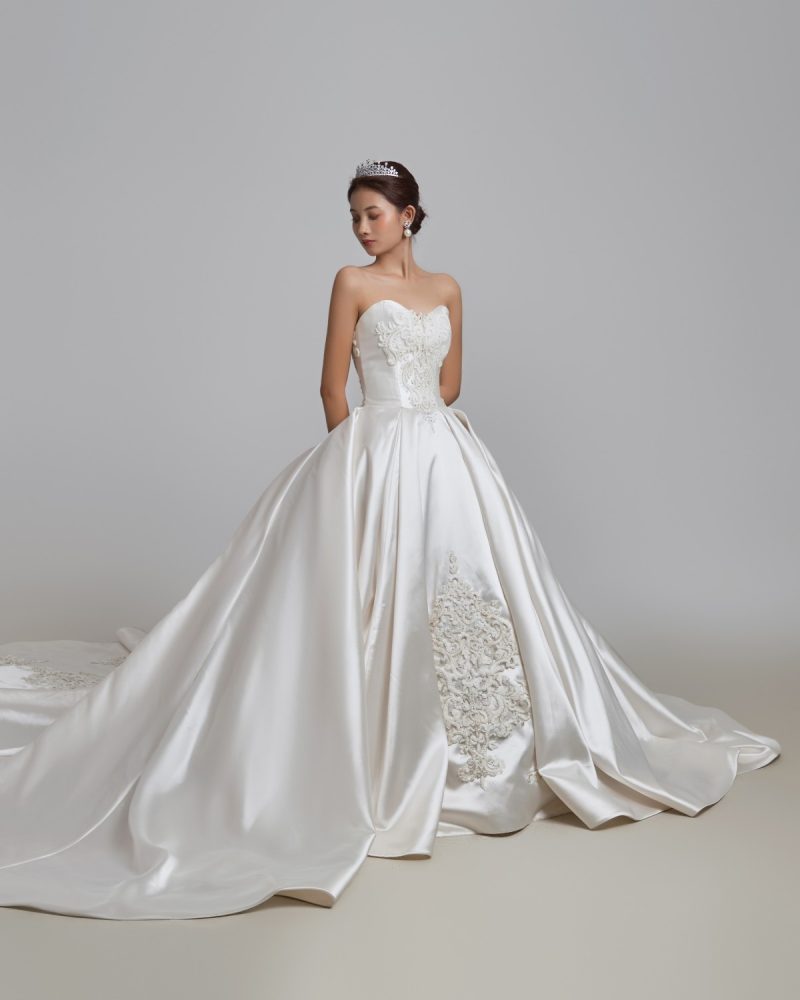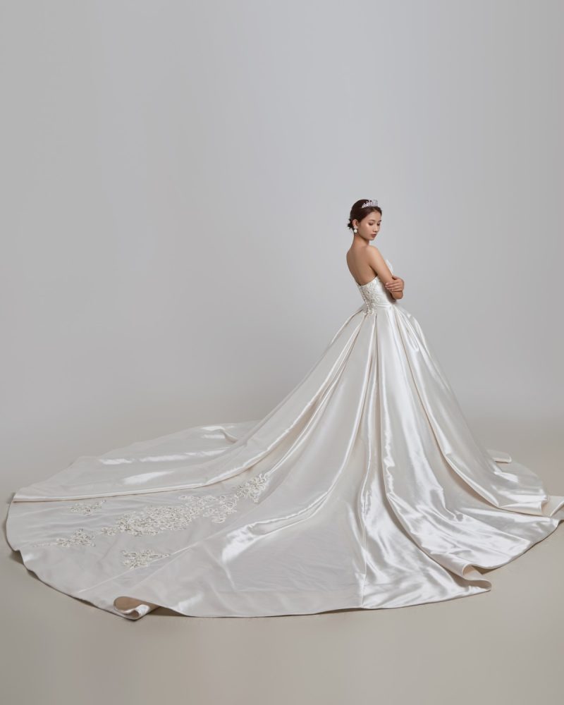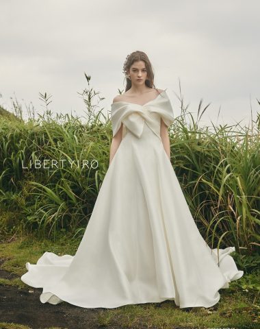 上品な光沢感のあるシャンブレーツイルをシルエットにこだわっって作ったプリンセスラインのドレスに合わせて、デザイナー自らこのドレスのために描いたオリエンタルな図案に、レース糸や極小のビーズを立体感や陰影感が出るように繊細に変化をつけながら時間をかけて施したオートクチュール刺繍がとても存在感のあるロイヤルウエディングドレス。インパクトのあるパワーショルダーのインナースリーブは、デコルテ周りは透明感たっぷりのチュールに刺繍を施しているので首周りを華やかに美しく演出します。