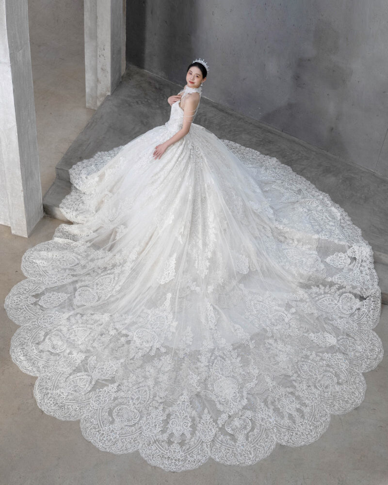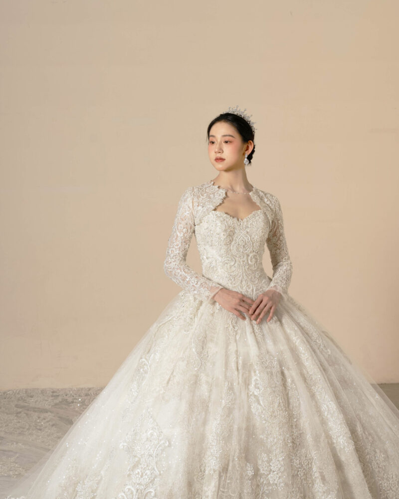 圧巻のシルエットとロングトレーンのインパクトのあるドレスには700時間もの時間をかけて細かくハンドビーズ刺繍を施し豪華絢爛の唯一無二のデザインに仕上げました。職人により丁寧に作られたビーズ刺繍は、繊細なディテールとともに、ドレスに高級感を与えています。ビーズ刺繍の美しいレースを2種類重ねるだけではなく、その下にシークインチュールとグリッターチュールを重ねることでいろいろな光が反射して圧巻の輝きを演出します。また、トレーンの長さは330cmあり、花嫁の後ろ姿を優雅な印象付けます。個性的な小物の組み合わせでドレスを着る方それぞれ違う印象の組み合わせを楽しいでいただけます。この特別なドレスは、花嫁の美しさを引き立てるだけでなく、ゲストの心にも強い印象を与えることでしょう。まさに一生に一度の瞬間にふさわしい、夢のような一着です。