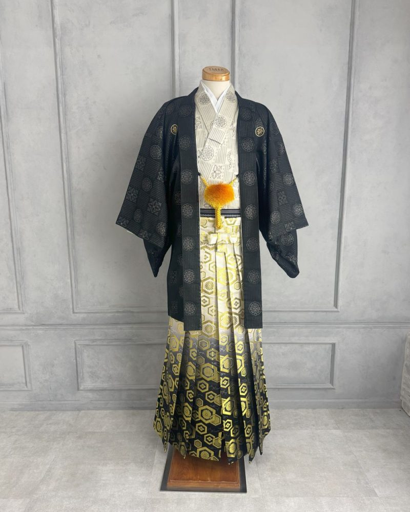 - 男紋付 黒ラメ×ベージュ元禄模様 No.115 L