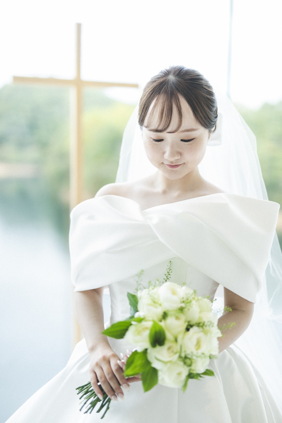 元々お顔が小さい新婦様ですが、ボリュームのあるオフショルダーを付けることで、より小顔に、、