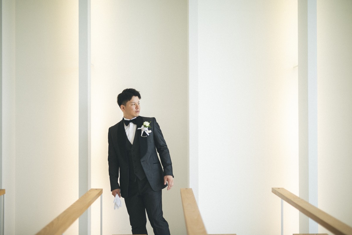 新郎様もグレーのタキシードでスタイリッシュに着こなしていただいています。